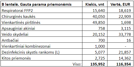 Paramą pradėjome gauti ne tik pinigais, bet ir priemonėmis iš fizinių ir juridinių asmenų. Gautų priemonių kiekiai pateikti B lentelėje ataskaitos pabaigoje.