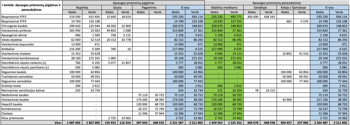 Kitas priemones (300 000 FFP2 respiratorių, 665 FFP3 respiratorių, beveik 11 000 kombinezonų, 100 000 deguonies kaukių, 50 000 trachėjinių vamzdelių, 100 000 deguonies vamzdelių ir 42 900 vienkartinių kaukių), kurios dar yra pakeliui arba ką tik pasiekusios organizaciją, planuojama išdalinti medicinos įstaigoms per birželio mėnesį bei pirmąsias liepos dienas. Kiek jų liks operaciniame rezerve – pateiksime galutinėje ataskaitos versijoje.